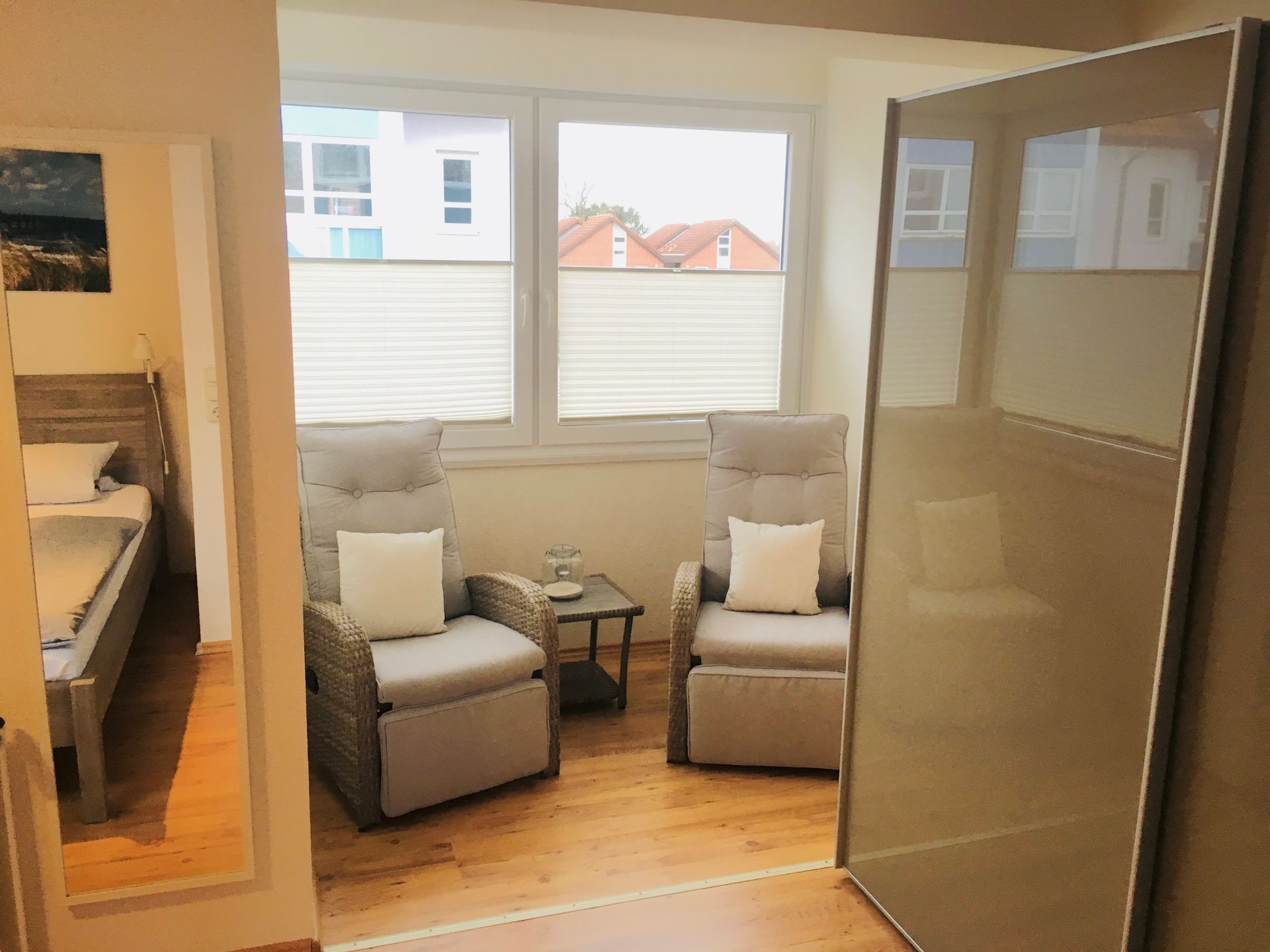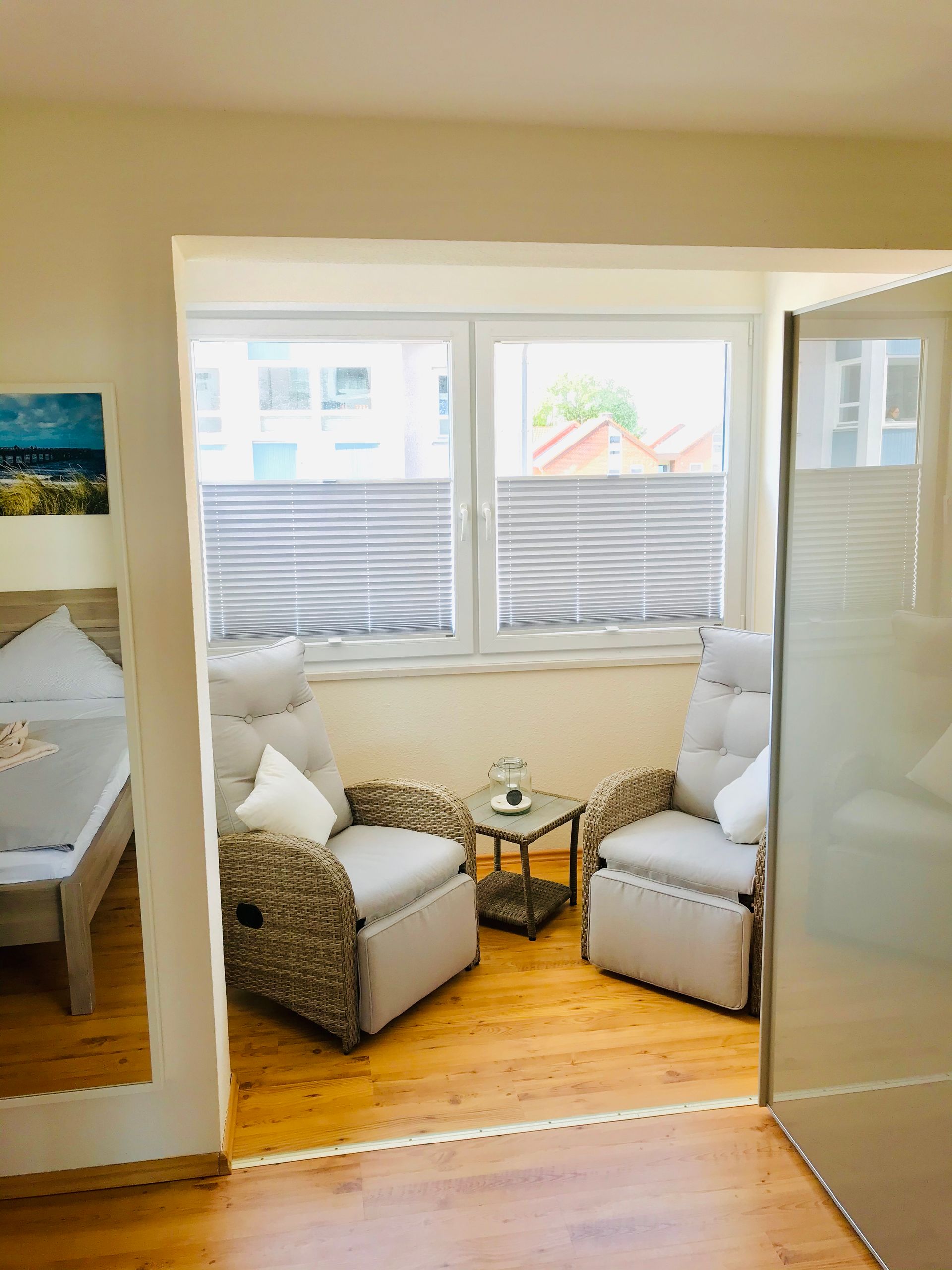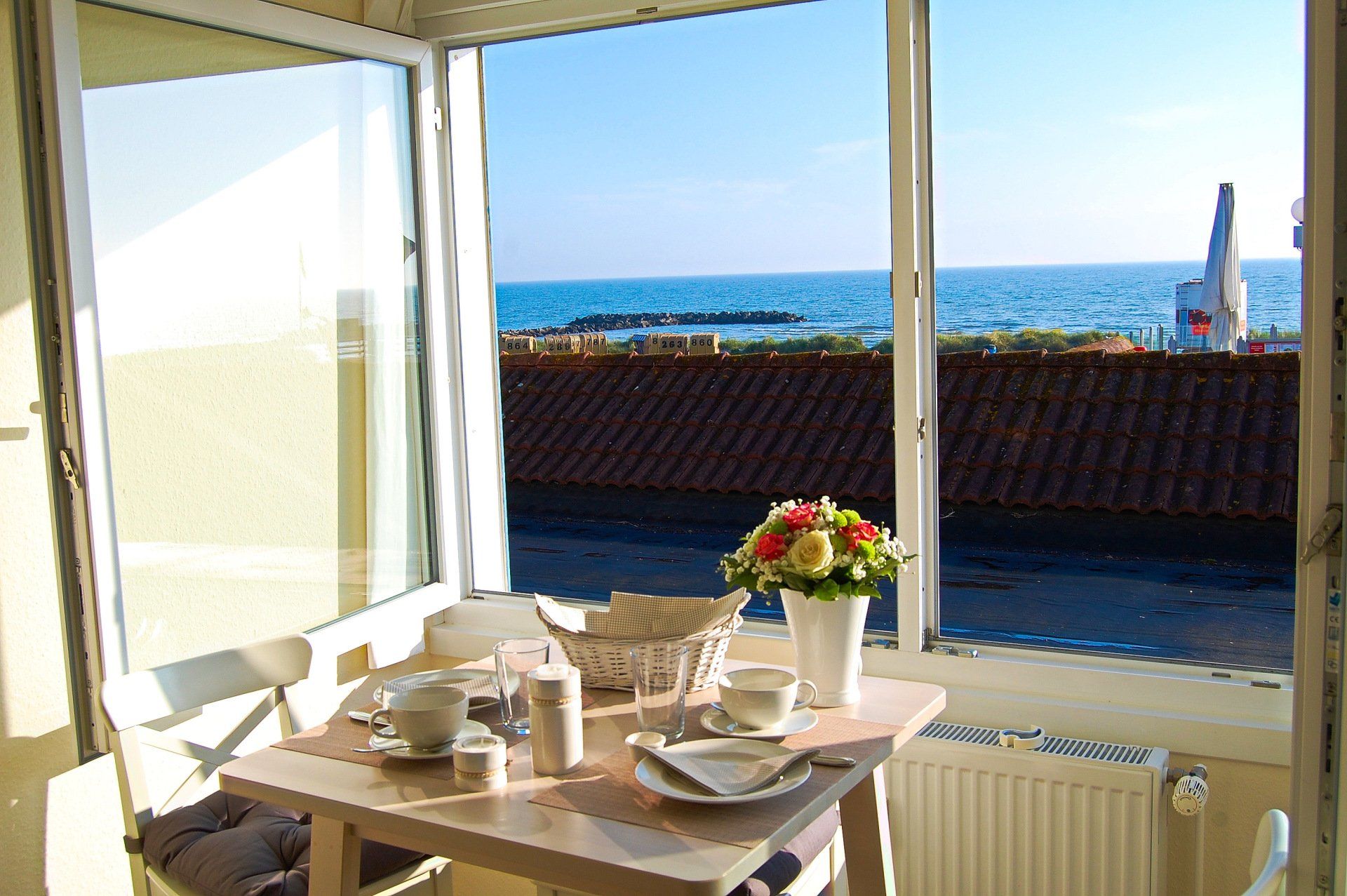 Das gemütlichen Wohnzimmer wurde ganz neu eingerichtet. Auf dem Sofa kann man sich richtig wohl fühlen. In nur wenigen Handgriffen kann man es auch ausziehen und man hat eine Fläche von 140 x 200. Auch der Ohrensessel lädt zum entspannen ein. Neben einem Flachbildfernseher, steht auch ein blu ray player und ein Radio mit CD/DVD-Player zur Verfügung. Sie haben vom Wohnzimmer einen herrlichen Blick direkt aufs Meer und auf die Seebrücke. Sie können vom Frühstückstisch die Schiffe beim Ein- u. Auslaufen in die Kieler-Förde beobachten. Wir haben die Stühle so ausgewählt, dass Sie auch im sitzen, ohne Sichteinschränkung auf die Ostsee schauen können.