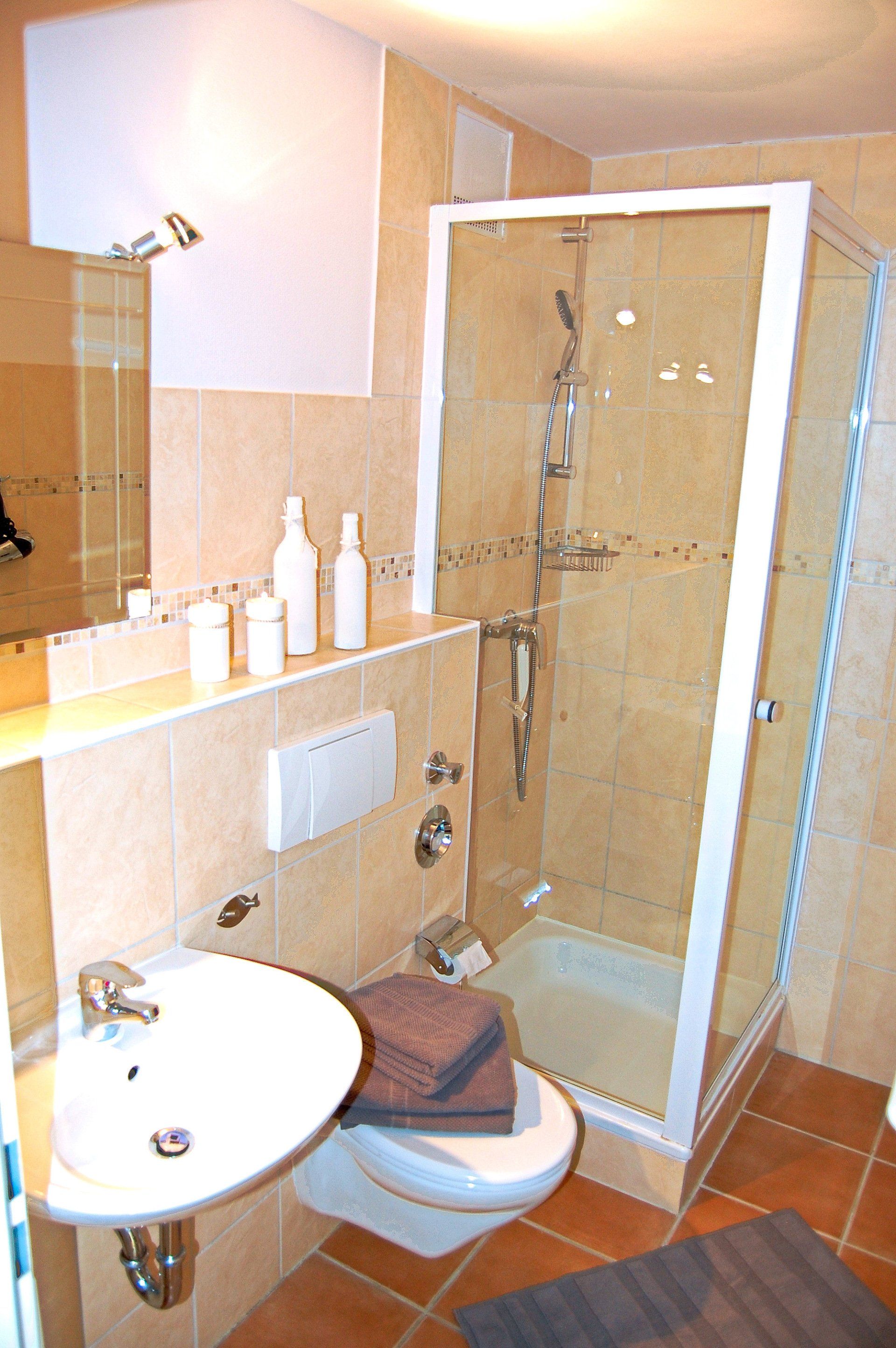 Das Badezimmer ist mit einer Dusche, ein Waschbecken und ein WC eingerichtet. Auch im Bad finden Sie die liebevolle Dekoration.
